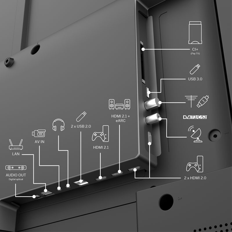 – Connecteurs: 2 x HDMI 2.1 – 2 x HDMI 2.0 – 3 x USB 3.0, 2 x USB 2.0